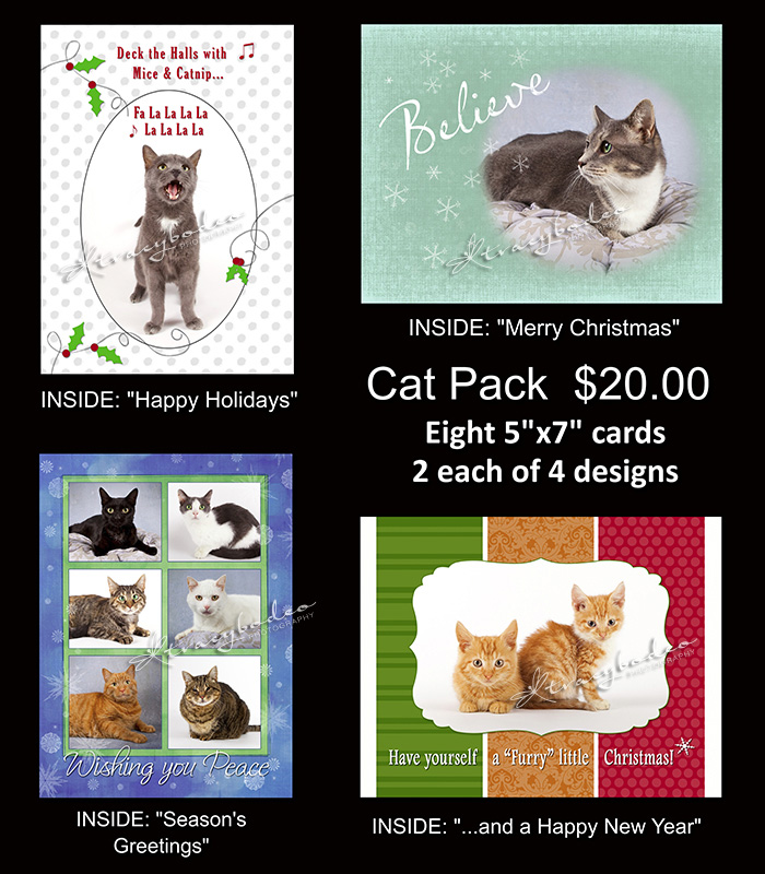 The 2011 Center for Animal Health and Welfare holiday cards are now available for purchase to help raise money for the Center. Each pack of eight 5×7 cards (2 each of 4 designs) costs $20.00 and all proceeds go directly to the animals at the Center. You can choose a cat pack or a dog pack or get one or more of both! If there is one particular style that you like best, you can also order one pack of 25 cards for $60.00. All of the animals featured on the cards are residents of the CAHW and some of them have been there for 1 or 2+ years. We are hoping not only to raise some money but also to raise awareness of our homeless pets and find them homes for the holidays. If you are interested in adopting one of our homeless pets or in purchasing a pack or two of our cards, please visit the Center in Easton www.healthyanimalcenter.com or contact me directly at mail@tracybodeo.com . Thank you to our sponsors who helped cover the cost of printing: “A Furry Tail Come True” Doggie Daycare and Boarding www.afurrytailcometrue.com (Hellertown, PA), AVH Veterinary Group www.avhvet.vetsuite.com (Pen Argyl, PA) and Bob & Joanie Thompson of Thompson Photo Arts- nature and wildlife photography http://thompsonphotoarts.com. Thank you for your support!
